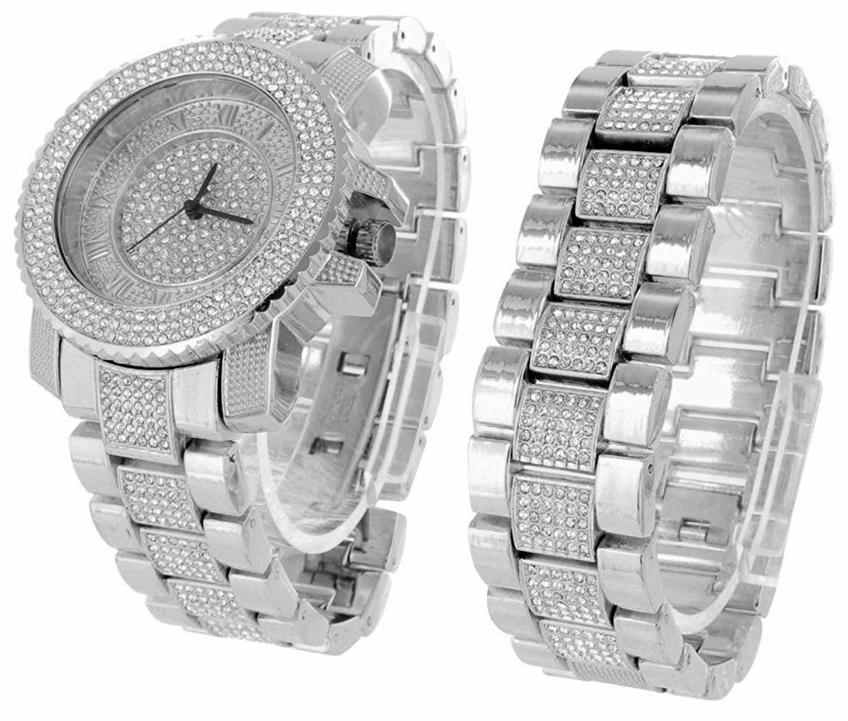 47mm Polished Rhodium Plated Clear Cubic Zirconia Flat Iced Out Watch Bracelet Set 8 5 Inches Walmart Com